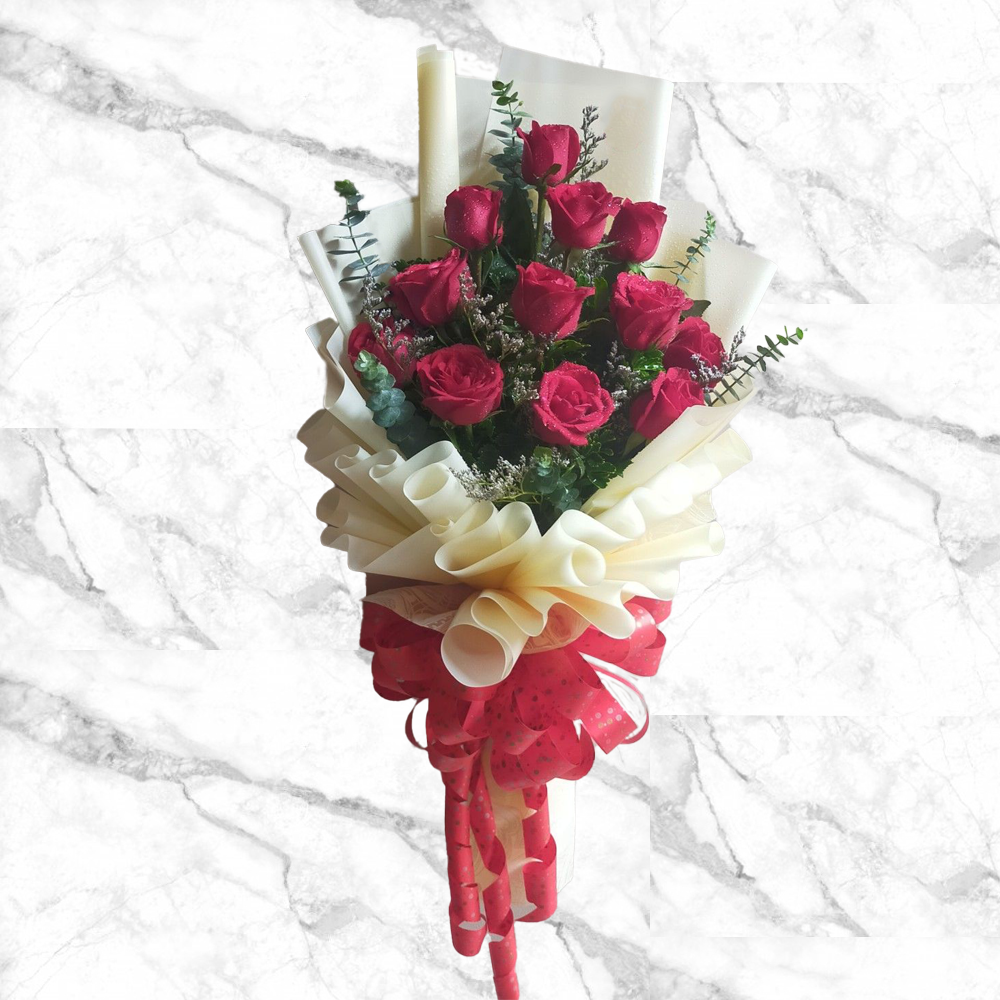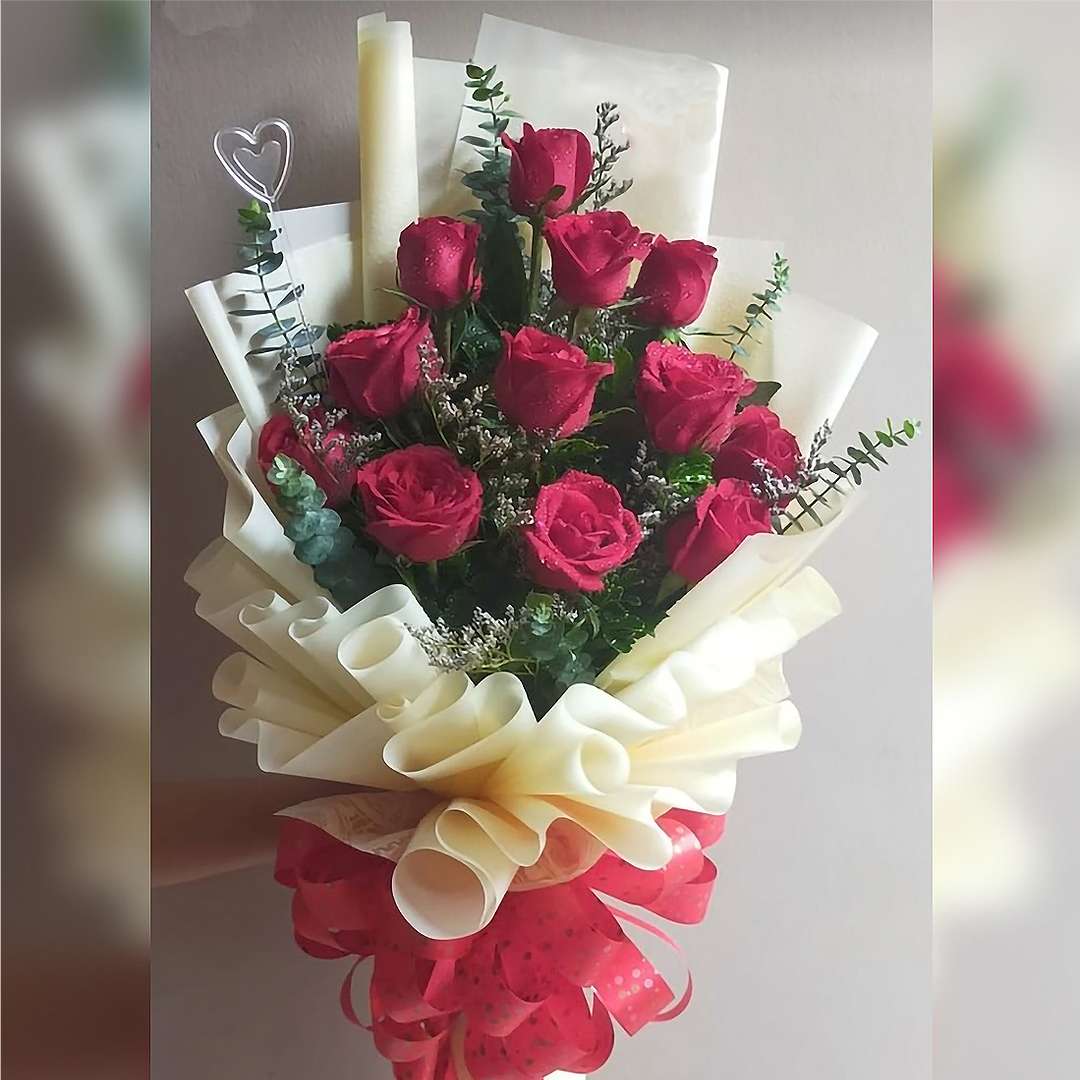 Bouquet de frescas rosas rojas, sumergidas en fino follaje